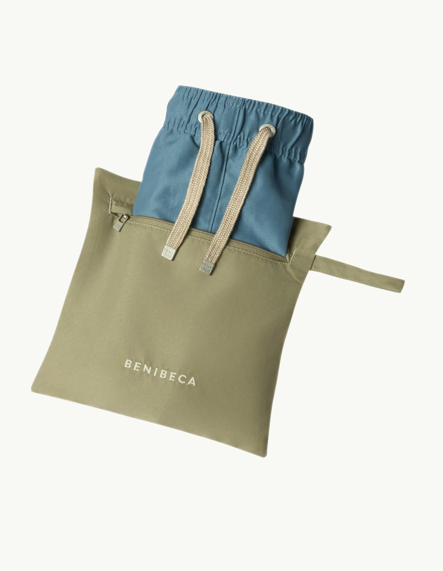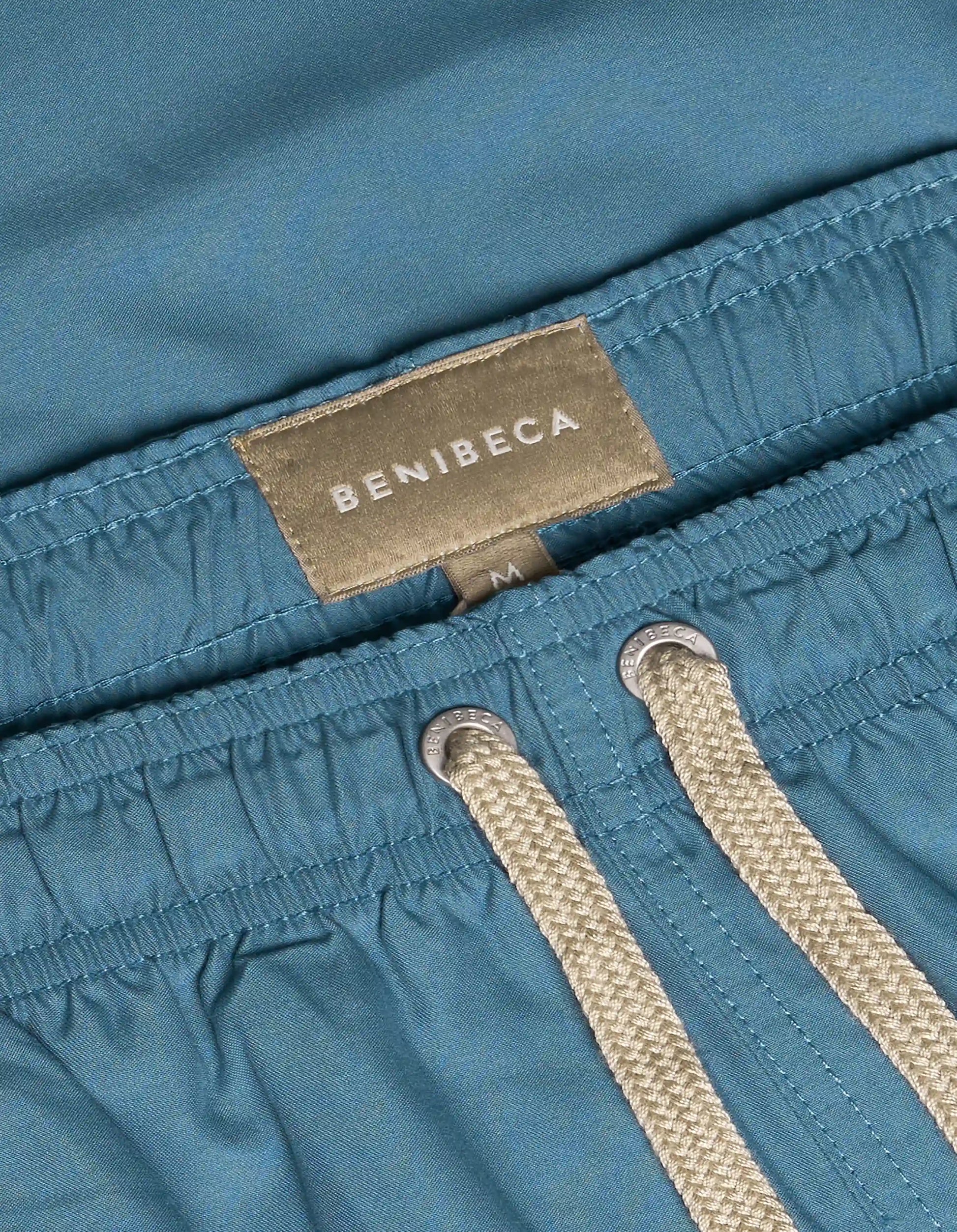 This classic mid-length short has become one of Benibeca's summer icons. With a contemporary regular fit, it is the ultimate expression of relaxed luxury. The swim shorts are made from plastic rescued from the ocean and transformed into recycled polyester fibers. This sustainable and technological fabric is unique for its lightness, strength, quick drying time, and the softness of our "peach skin".