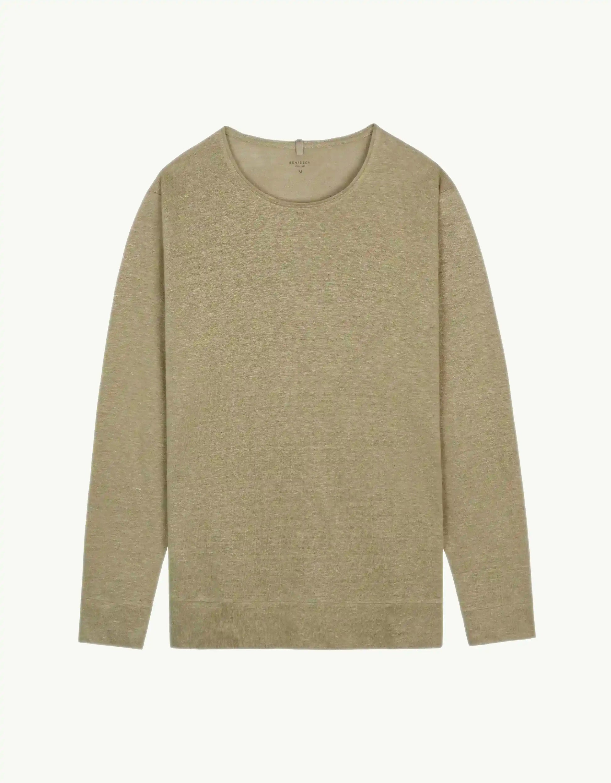 Make your summer wardrobe more versatile and breathable with our best-selling pure linen crew neck sweatshirts. These super-popular styles are wonderfully lightweight with a semi-opaque knit and a bumpy, uneven, slubby texture. Employing a super-soft, lightweight fabric and a loose silhouette, these linen sweatshirts have a luxurious feel and superb fit. Fresh, flexible, and beach-ready, they can be worn with any of our pants or swim shorts, combining beautifully with all our natural organic colour palettes.