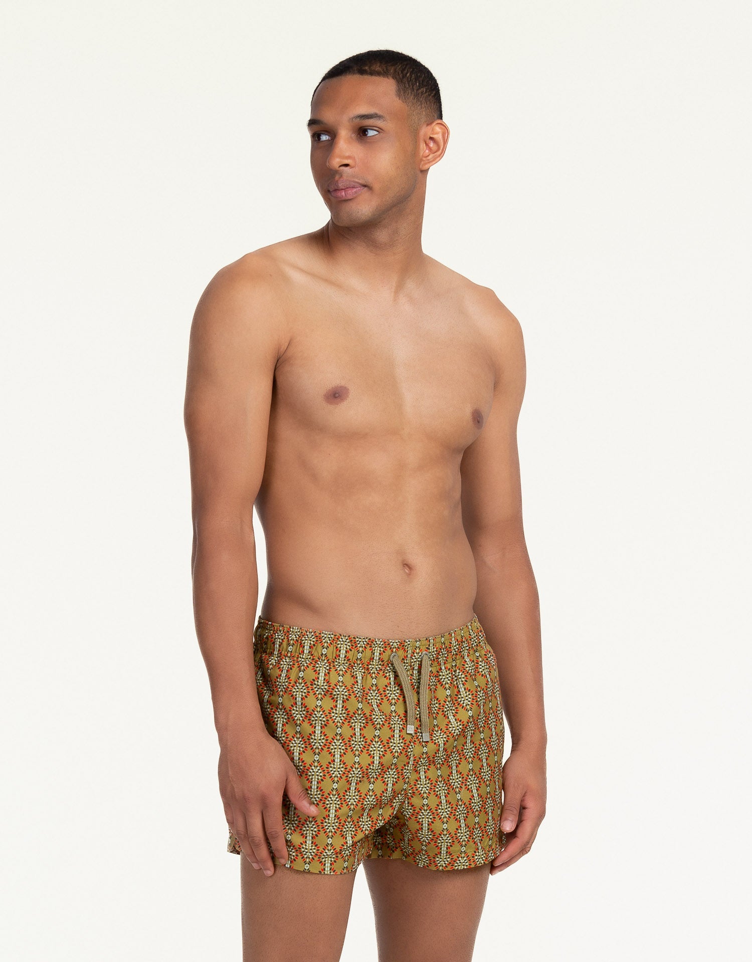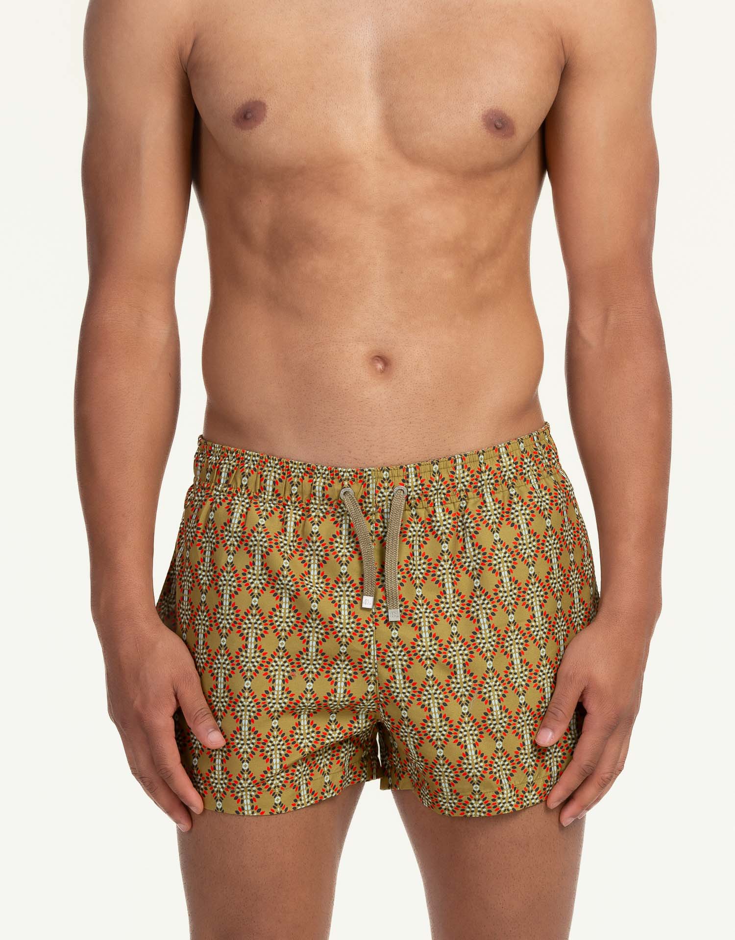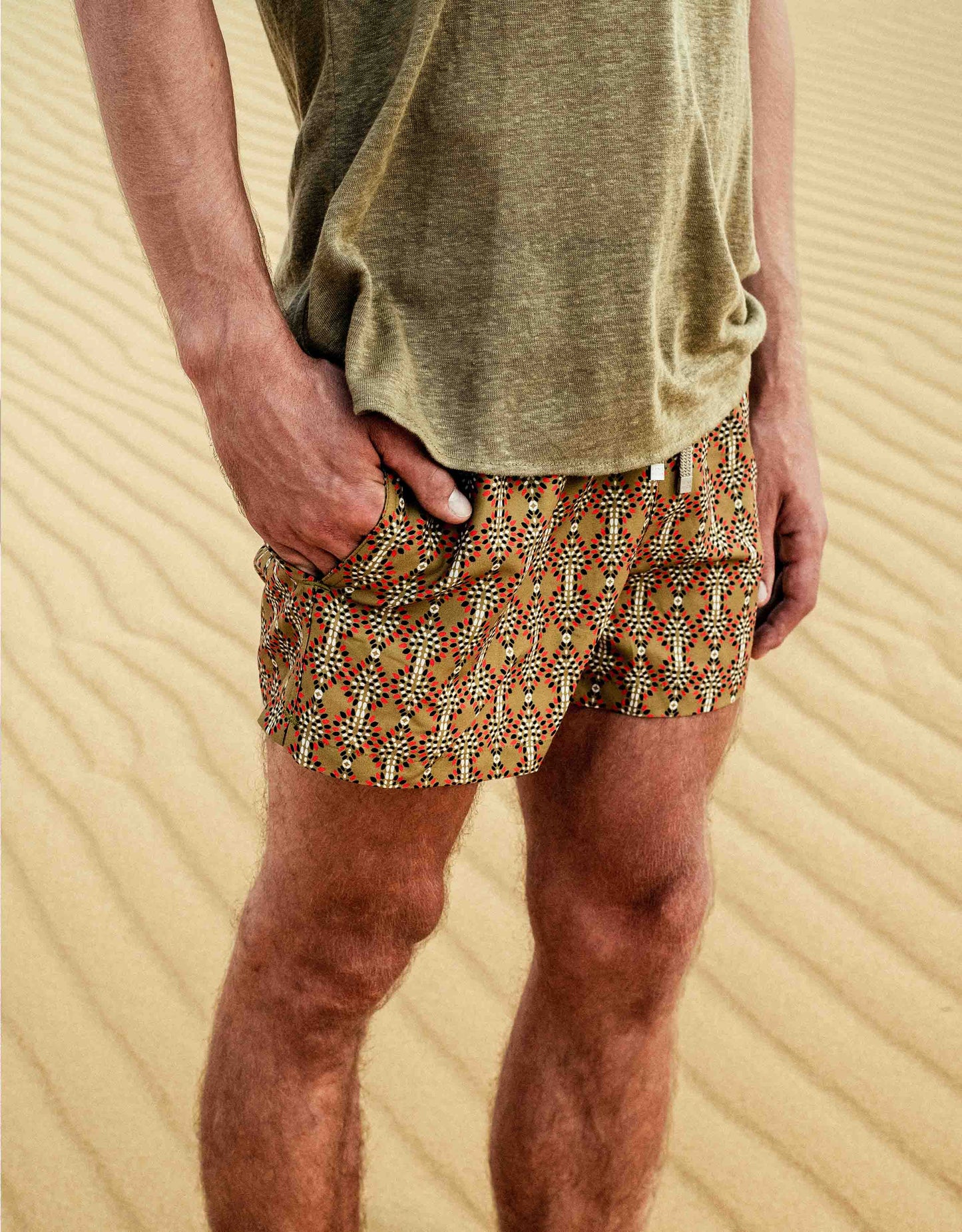 These are swim shorts for those who want it all. A tailored-inspired fit, suitable for the beach club sunrise as well as for a dip in the sea. The swim shorts are made from plastic recovered from the ocean and transformed into recycled polyester fibers. This sustainable and technological fabric is unique for its lightness, resistance, quick drying time, and the softness of our "peach skin".